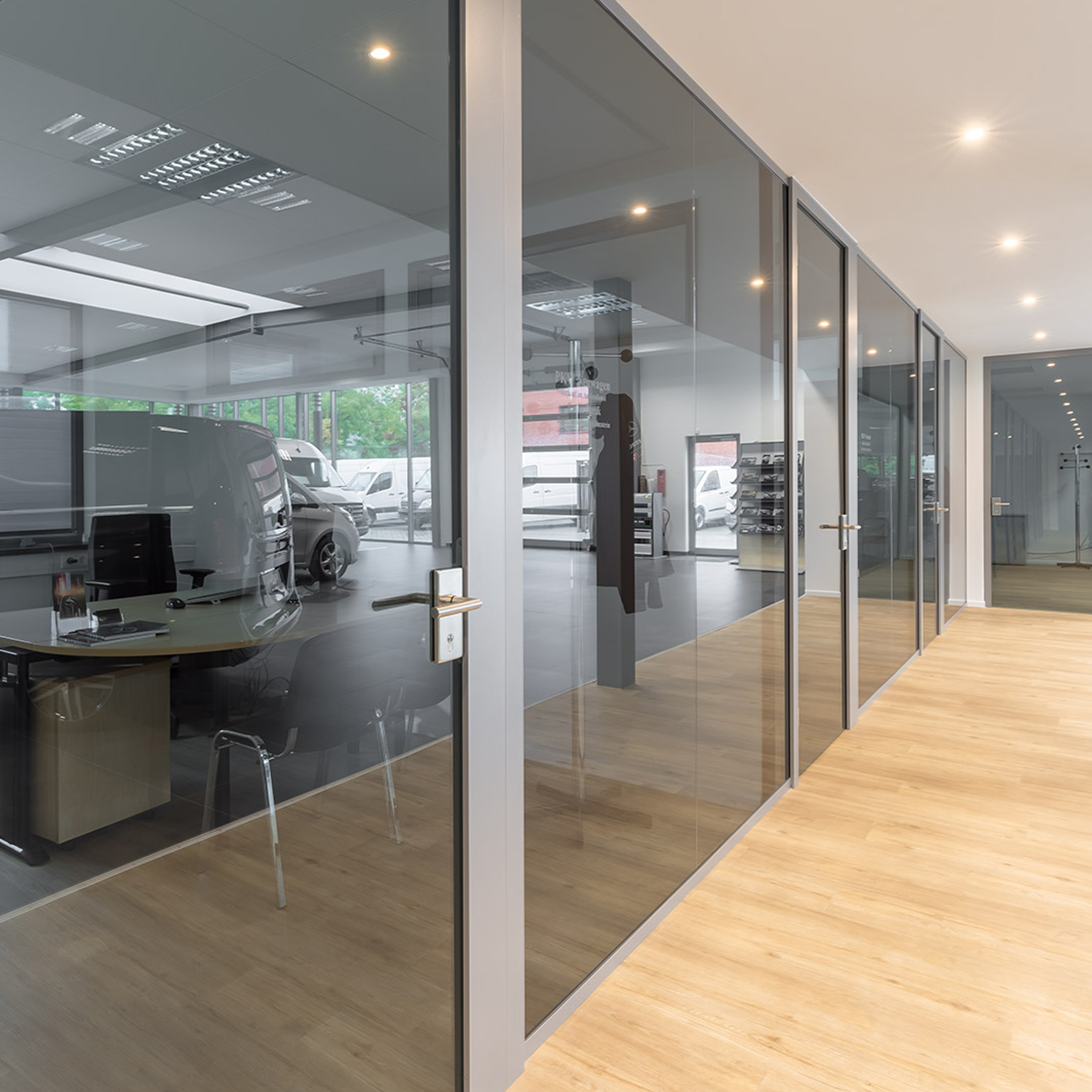 Die Türen öffnen wahlweise nach außen oder nach innen. Durchgängige Flächenbündigkeit mit filigranen Aluminiumzargen und Ansichtsbreite von 18mm.